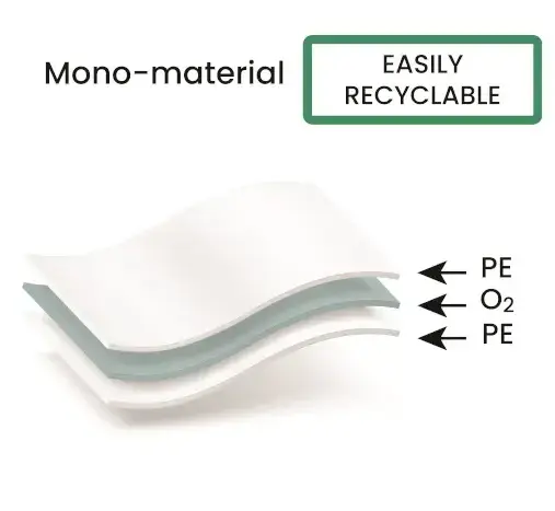 - Mono-material laminates (PE/PE, PP/PP) are replacing complex multi-layer laminates where possible. The benefit: improved mechanical recycling compatibility. The trade-off is performance—mono-materials often require gauge increases or active solutions (absorbers) to match barrier needs.
